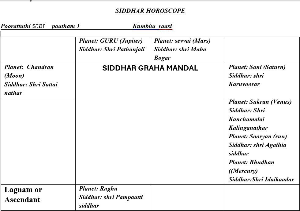 etc. They are being analyzed in nine different angles of the positioning of the planets in the horoscope. Then the regular horoscope has been converted to SIDDHAR HOROSOCPE, , in which one or two Siddhars were assigned on the basis of merits of the horoscope